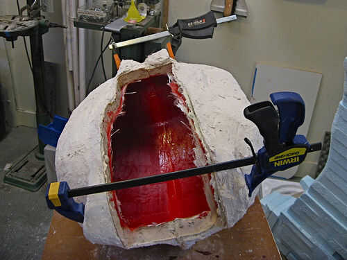 Cuenta cómo el molde de yeso tiene pisos construidos en para la sujeción. En este punto, llegar en y poner tiras de vidrio a lo largo de la franja entre las dos mitades. El agujero en el molde coincide con la parte superior del Xtracycle. Se requeriría un segundo molde (usando la misma forma positiva) si quería hacer nodrizas que son compatibles con el MundoMundo o bicicleta regular estantes.