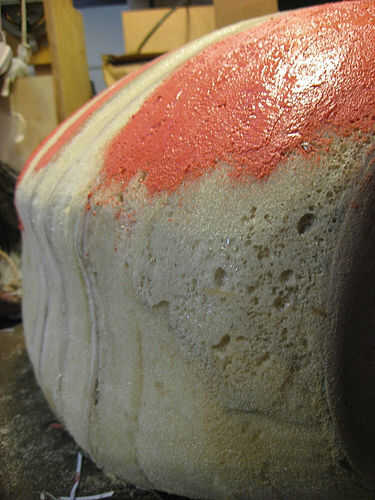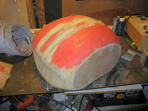 Espuma tiene agujeros grandes que deben llenarse. Espesar la resina de epoxy con microesferas y manchar ese tipo de cosas todo el formulario. Te recomiendo usar un tinte diferente para cada capa que se acumulan, así que cuando usted está lijado más adelante sabrás cuando estás a punto de golpear la espuma.