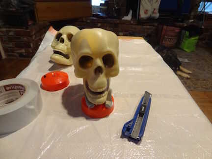 Paso 1: materialesCráneos de tienda de dólarPintura en aerosol-Utiliza la pintura "martillada" de Walmart-rojo-negroPeriódico - paños baratosPaso 2: pintura empecé con golpear los cráneos con la pintura negra de lejos por lo que sólo consigue sa