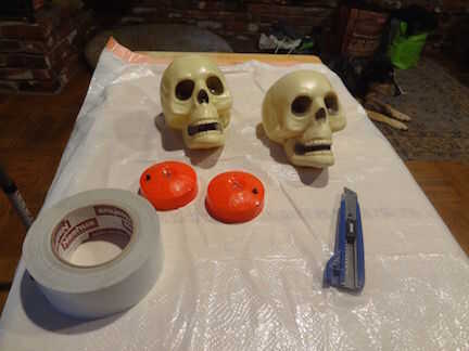Paso 1: materialesCráneos de tienda de dólarPintura en aerosol-Utiliza la pintura "martillada" de Walmart-rojo-negroPeriódico - paños baratosPaso 2: pintura empecé con golpear los cráneos con la pintura negra de lejos por lo que sólo consigue sa