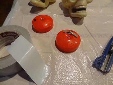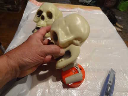 Paso 1: materialesCráneos de tienda de dólarPintura en aerosol-Utiliza la pintura "martillada" de Walmart-rojo-negroPeriódico - paños baratosPaso 2: pintura empecé con golpear los cráneos con la pintura negra de lejos por lo que sólo consigue sa