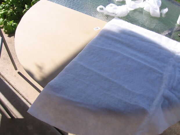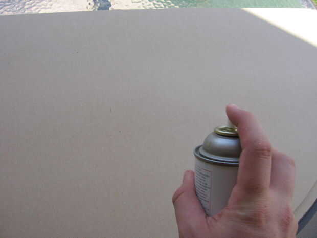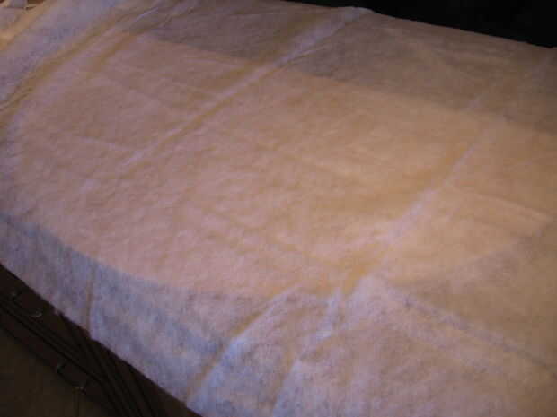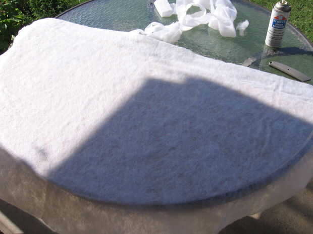 Para el bateo a la Junta, utilicé pegamento spray. Rocíe a sí mismo una buena capa. Ahora coloque el bateo como lo haría la masa de una tarta, en secciones. Después del bateo, usar el rodillo para la pelusa del rodillo plana y deshacerse de cualquier arrugas. Afortunadamente, pegamento de aerosol no establece inmediatamente, para que tenga un hoyo poco tiempo para estirar y volver a colocar el bateo.