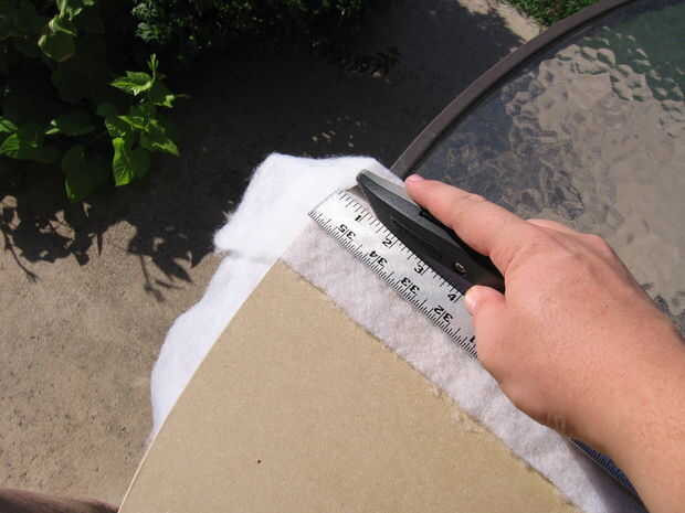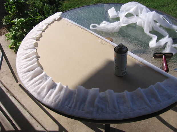 Voltee la pieza una vez que el pegamento ha tenido la oportunidad de secar un poco. Utilice el pegamento de aerosol establecer sobre un barrenador de pulgada y media alrededor del perímetro del semi-círculo. Tire el bateo firmemente alrededor del borde y enrollar sobre el pegamento con el rodillo para mantener las cosas bajo control.