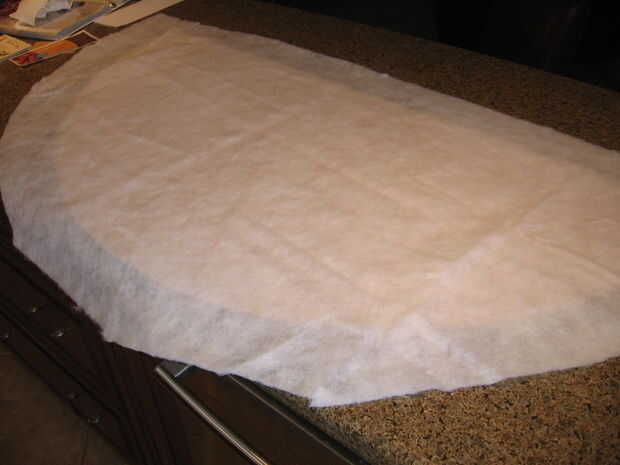 Interior a la A.C.! Tirar el primer semicírculo sobre el mostrador y en el bateo! Corte un semicírculo de bateo darse una frontera generosa para trabajar con. Este material es sorprendentemente difícil y molesto para cortar, asi que tengan paciencia.