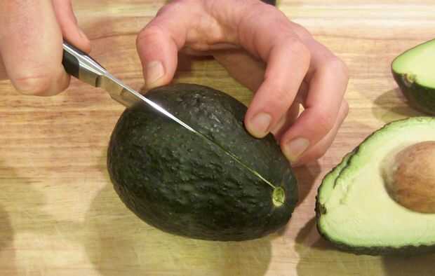 Usando un cuchillo afilado, cortar el aguacate por la mitad a lo largo girando el cuchillo en el aguacate. Una vez a la mitad, separe las mitades de aguacate colocando una mano en cada mitad y girar, torcer las manos en direcciones opuestas.