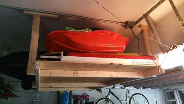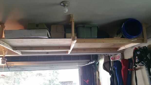 Después de tener sus tacos el techo que usted necesita para decidir cómo lejos abajo la admite debe colgar. Una de mis estanterías es aproximadamente 12 pulgadas, que el otro es 21 pulgadas hacia abajo. Eso es lo que funcionó en mi garaje así que su propia decisión aquí. Una vez que tengas la admite corte a la longitud Conecte cada uno a una cornamusa. Usé 2 tornillos largos, de 3 pulgadas, en cada soporte.