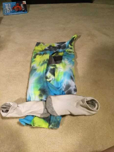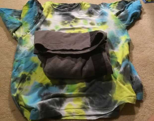 Coloque los pantalones cortos encima de la camisa, luego doblar la shirt.look en la imagen, asegúrese de que a veces sólo en cuanto a la imagen de muestra. Por último deberás tomar el par de calcetines y separarlos si no lo has hecho ya. luego coloque el lado abierto hacia el exterior de la camisa.