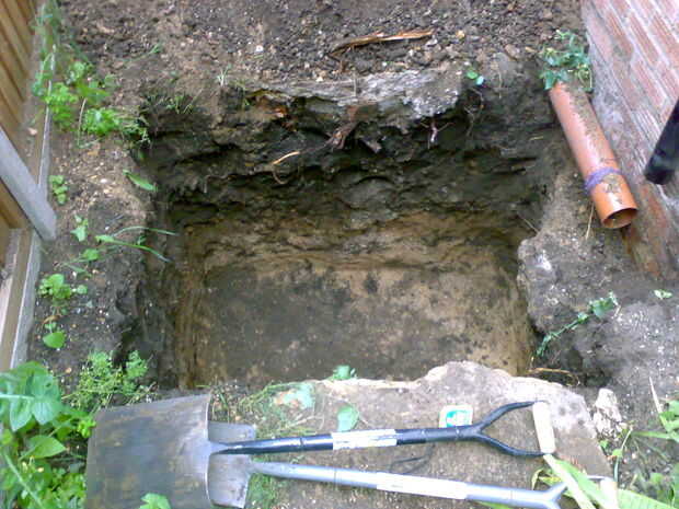 Cavar un agujero muy grande. Un estándar IBC puede comprar GBP 40-50 y es 1mx1mx1.2m. Tomó cerca de 3 por la noche después del trabajo para cavar el agujero. Tenemos suerte y tenemos suelo ligero y agradable.