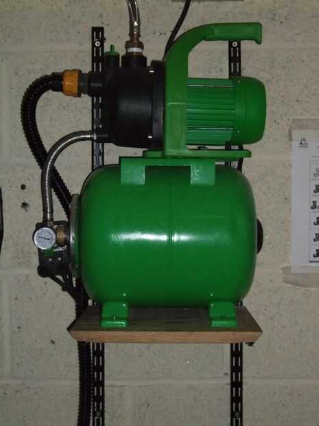 Montado en el garaje. Funcionó la manguera de aspiración a través de la pared en el IBC. Funcionó el tubo de 15mm al grifo del jardín, que ahora funciona con pura agua de lluvia!