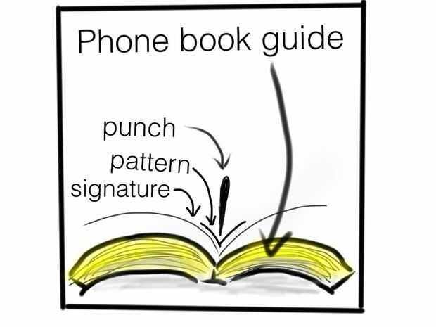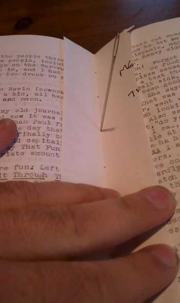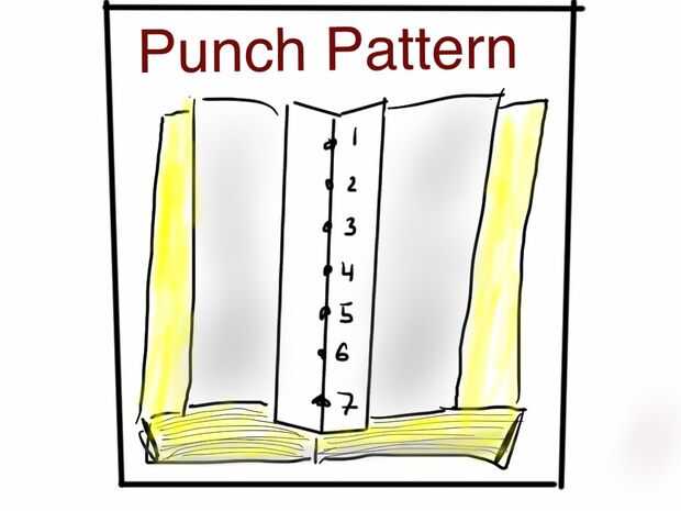 El libro finalmente se realizará mediante roscado junto firmas, pero primero debe preparar un patrón, por lo que se perforan todos los agujeros de rosca en el lugar correcto. Poniendo la firma en un libro grande, como una agenda, es posible guiar cuidadosamente la aguja en el pliegue de la firma para conseguir un golpe consistente.