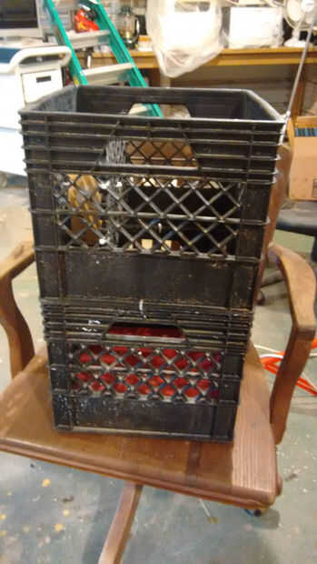 Tenía una caja de cartón llena de piezas de aluminio y otro material largo y tuvo que apoyarse contra un banco o caiga. Siempre estaba en el camino. Decidido poner unas cajas de leche a buen uso.