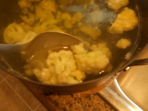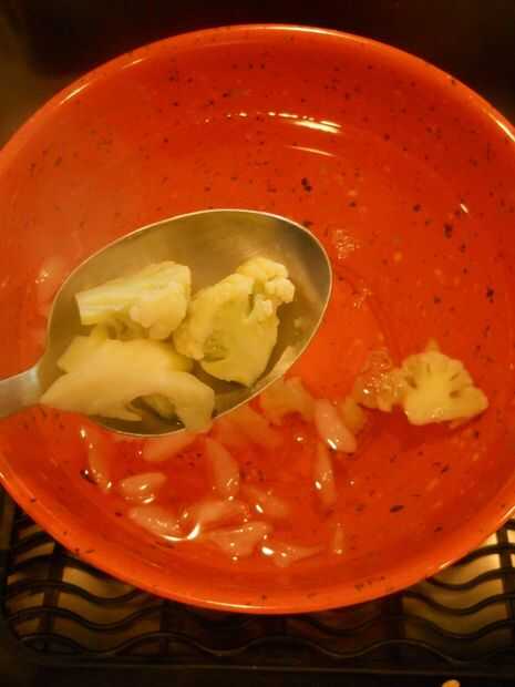 Con una cuchara, escurrir y retirar los trozos de coliflor. Coloque las piezas en el recipiente con hielo. Se recomienda altamente utilizar una cuchara con ranuras en ella para drenar el agua.