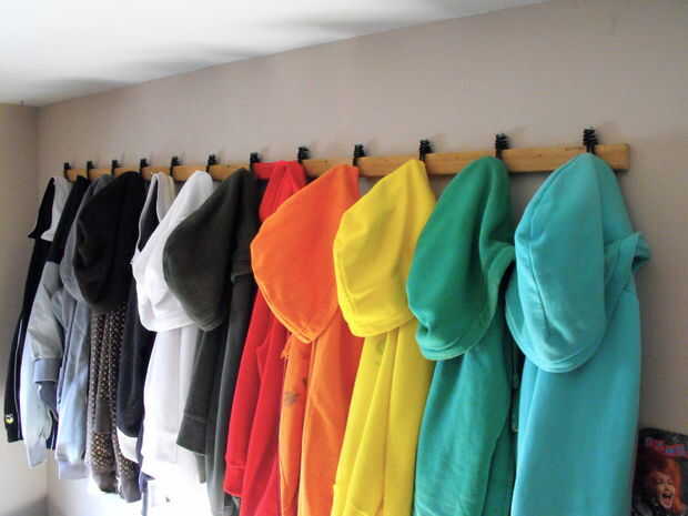 simplemente hecho de 3/4 X 1 1/2 Banco de madera. Los extremos de cuerdas bunggie fue utilizado como un gancho con un look de primavera, Perforado en el lado con unas arandelas a disperce la presentacion atornillados a la pared con anclajes del basculante para paneles de yeso.