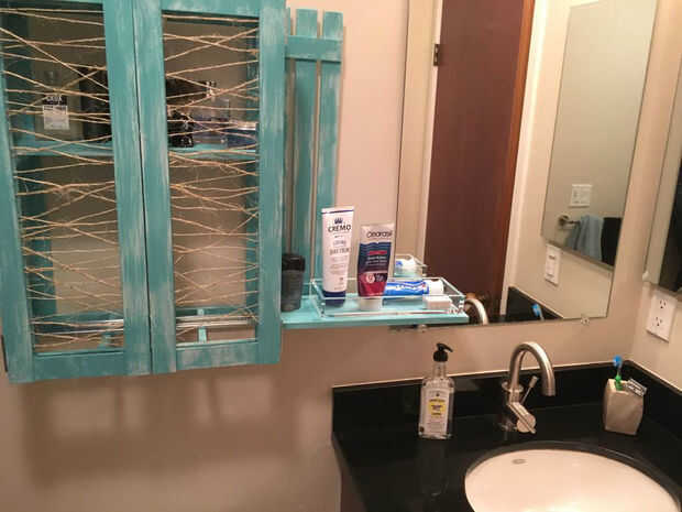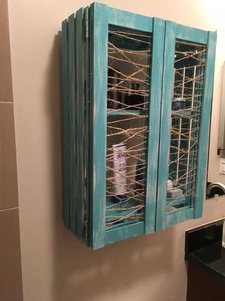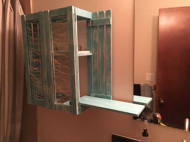 Una vez que las puertas son torcidas para arriba, poner todas las bisagras y cosas de nuevo y verificar cosas todavía abren y cierran adecuadamente. Una vez está todo buscando buena, colgar en la pared del baño! He añadido algunas almohadillas de vinilo a la parte posterior del gabinete para evitar rayar la pared.