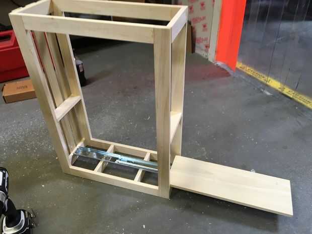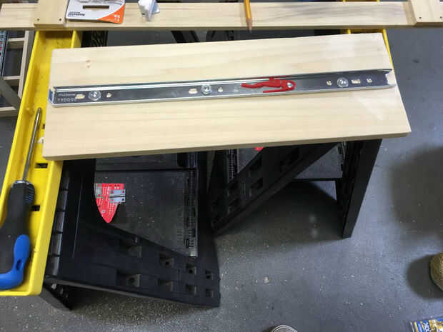 Tome la parte superior de la diapositiva del cajón y fije a uno de los tableros del estante en el paso anterior. Es más fácil alinear si colocar el tablero encima de la diapositiva en el gabinete y marca Dónde está la diapositiva.