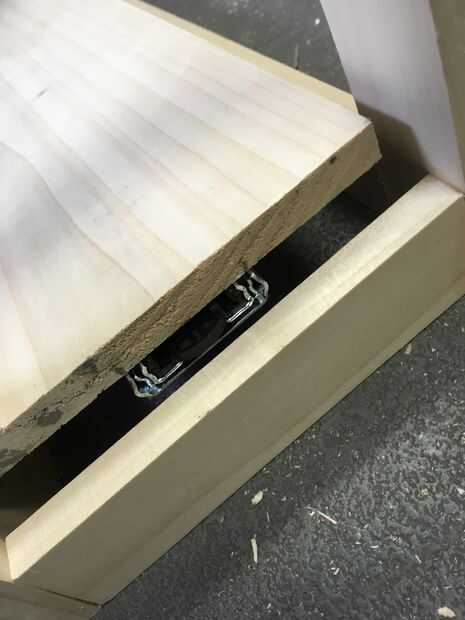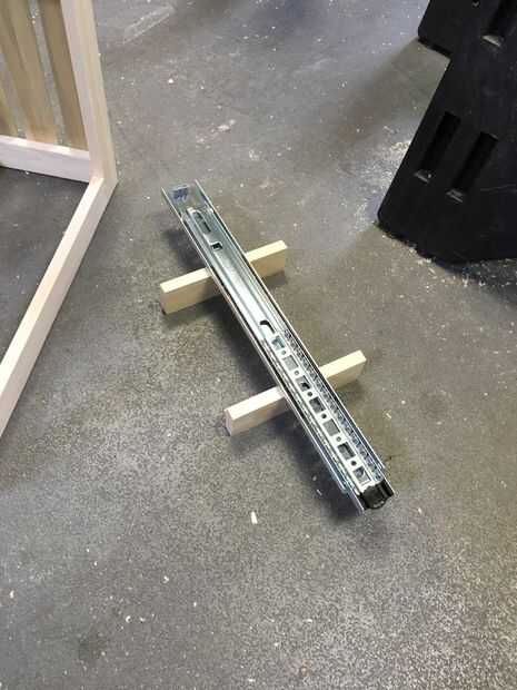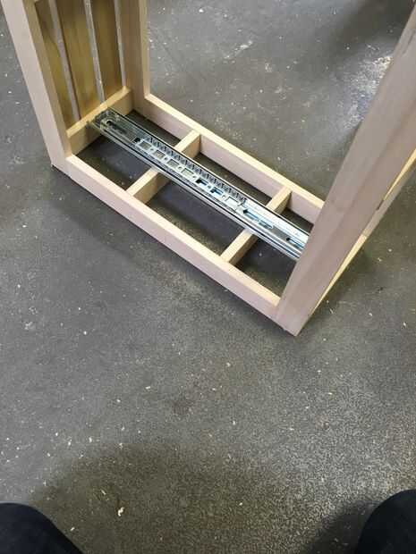 Coloque dos o tres adicionales 5,75" bloques espaciadores en la parte inferior y la parte inferior de la diapositiva del cajón en los bloques espaciadores. Alinee a los distanciadores con los agujeros disponibles en la diapositiva del cajón, marque y taladre. Colocar la diapositiva del cajón y los espaciadores en el marco del pegamento.