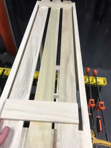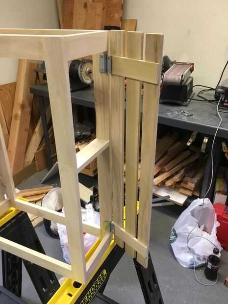 Una vez que el pegamento ha fijado, utilice las dos pequeñas bisagras para unir la puerta en el bastidor trasero del gabinete.