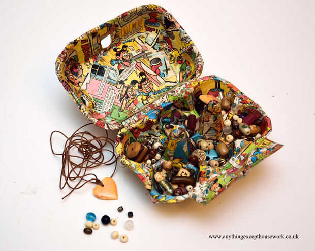 Este es otro proyecto de decoupage con comics (como tengo un montón de ellos usar!). Pensé que esto sería un gran proyecto para un niño hacer en clase o con un miembro de la familia como lo haría un gran regalo hecho en casa un pariente. Tal vez para una mamá o un gran quién rebordear o coser o un padre que necesita un lugar para guardar tornillos. O por supuesto podría ser al revés - no estoy en estéreo-mecanografiar cualquier persona!