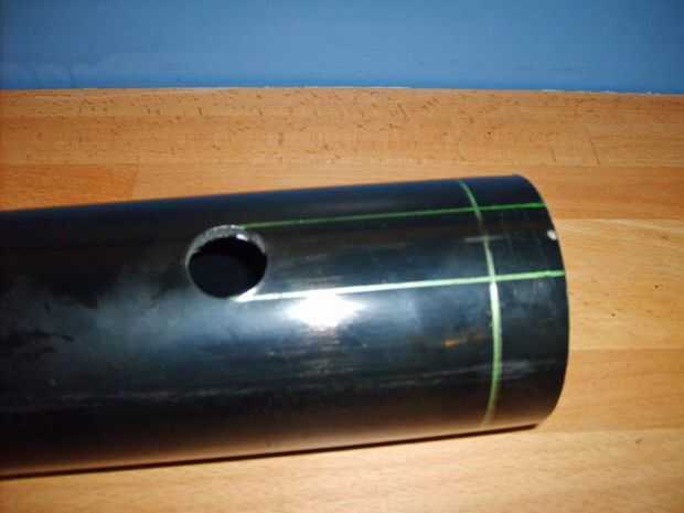 marqué el centro de un extremo de la tubería. Dibujé las líneas de diseño para donde va montar el mango de la pistola engrasadora. Agujeros para poner en marcha el fondo de las ranuras de la manija también perforados.