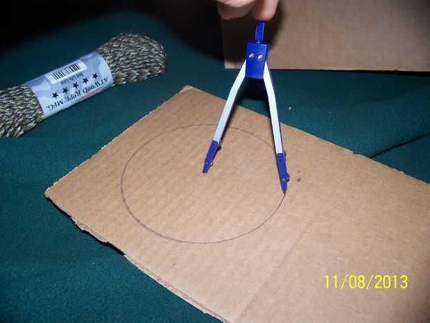 Tomar tú compás y dibuja dos círculos en el cartón alrededor de 1 en-1.5 en hacia fuera del centro para 550 paracord o menor y 1.5 - 2 en cualquier cosa más grande. Tú no tienes una brújula y entonces usar el enlace de más abajo.