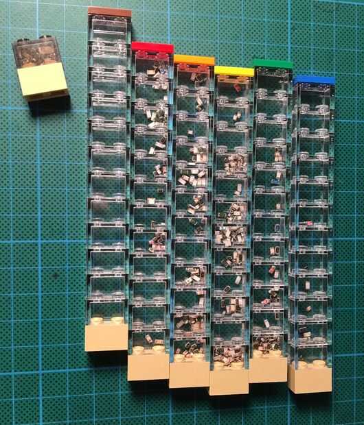 Para hacer las columnas reconocible, usé azulejos de colores para las tapas. Los colores representan números. Comúnmente se utilizan en electrónica (Wikipediao google por "códigos de color del resistor"). Usé los códigos para indicar el número de dígitos de los valores de las resistencias. Brown está parado para el 1 dígito, rojo 2, naranja 3 y así sucesivamente. Resistencias en la columna roja por lo tanto tienen valores en el rango de ohmios de dos dígitos (10, 12, 15 Ohms etc..).