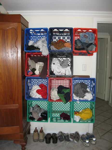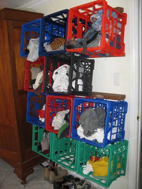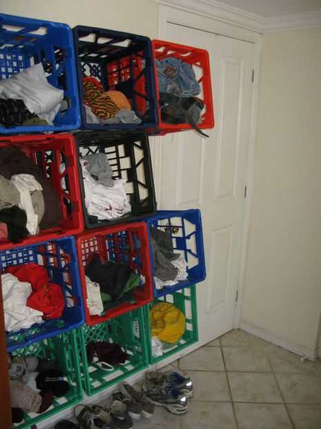 tuve que pensar en algo que me permita mantener mi ropa en una pila desorganizada pero no en el suelo. un par de ideas vino a la mente, como una pared de ganchos sólo podía lanzo ropa en y quedaría como Velcro. pero cuanto más pensaba el más estúpido que sonaba... finalmente he pensado en utilizar cajas de leche para el almacenamiento cuando vi uno se utiliza para el almacenaje de papel de lija en mi taller.