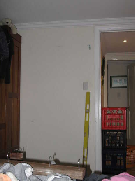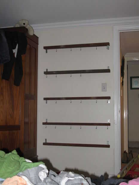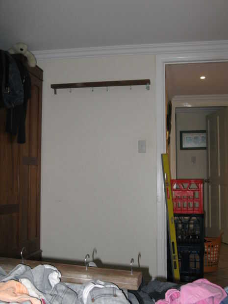Utilice un localizador de montantes para encontrar las vigas en las paredes y luego coloque los soportes de ángulo recto a la pared y luego a la plataforma de gancho. repetir.