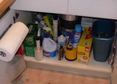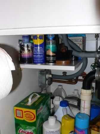La plataforma que he construido se ajusta a la esquina, aprovechando el espacio de lo contrario muerto al lado de la disposición. Descansa sobre los soportes por un lado y las ranuras entre los soportes superiores e inferiores en la parte posterior. Puede contener una cantidad sorprendente de peso. La manguera del lavavajillas lazos alrededor de él y no bloquea los cierres. Si nada nunca necesita ser apagado, desconectado, o volver a conectar con prisa, todo lo que tienes que hacer es tirar la parrilla derecho hacia afuera.