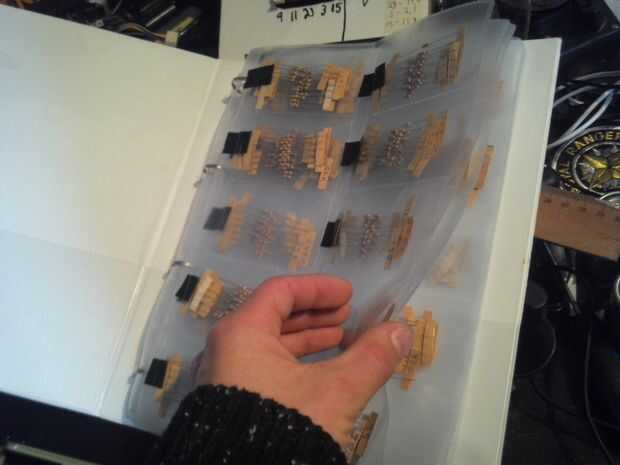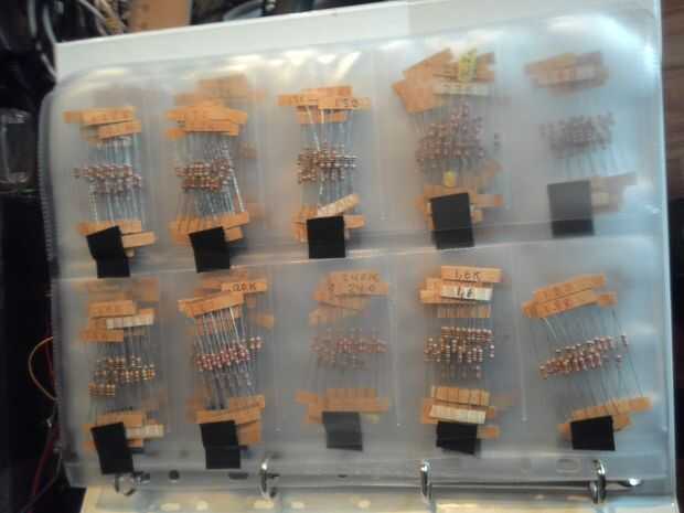hace un tiempo compré un terreno grande con gran cantidad de resistencias, ic y otros componentes electrónicos. Miró a su alrededor para una solución de almacenamiento de buena resistencia, pero realmente no se puede encontrar uno. Así que decidí hacer mi propio sistema. Las resistencias se almacenan en sostenedor de la tarjeta y poner dentro de una carpeta. Pagué como bruja NOK 100 es algo así como 16 USD. Tengo 10 "páginas" con los titulares de 10. la primera página es de resistores con 1-1,1-1,2-1,3-1,5 etc. mira la fotografía para ver cómo se organizan... Mira la foto 3 y leer el texto en el cuadro en la esquina superior izquierda - es el mismo para todas las carpetas. Página 2 es el mismo pero en vez de 1.0 tenemos 2.0!