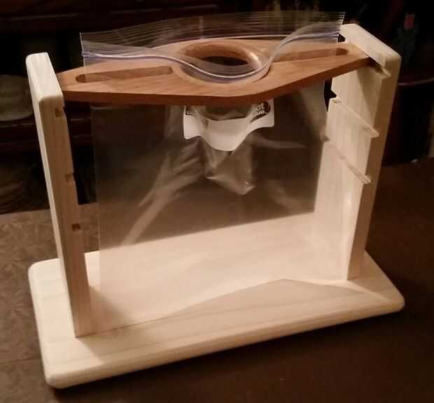Si alguna vez tienes que llenar bolsas de plástico para congelación o almacenamiento estás más familiarizado con el problema: Estás sosteniendo un pote lleno de cosas en una mano y tratando de mantener abierta una bolsa muy flexible a las cosas con la otra mano. La cosa es, realmente toma dos manos para sostener la bolsa abierta correctamente y si la olla está vertiendo de cualquier peso que no tiene en absoluto realmente toma dos manos para hacer la colada, así. Necesita cuatro manos. Mi esposa hace mucho de congelar y almacenar cosas - especialmente en el verano - y si no estoy cerca para ayudar a menudo significa un hermoso lío en la cocina cuando ella trata de hacerlo por sí misma. Hemos llegado a través de unos gadgets diferentes diseñados para sujetar una bolsa mientras se rellena, pero todos parecían ser dirigido solamente a medias. No eran particularmente estable o no trabajan con una variedad de tamaños del bolso o simplemente no funcionaba muy bien en todo.