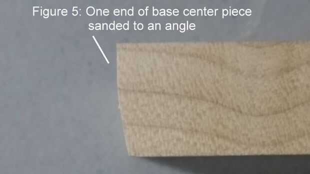 Comenzar a lijar un extremo de la pieza de inserción, comprobar a menudo si cabe entre las piernas aún. Arena en un ángulo para que la parte inferior de la pieza se vuelve un poco más corta que la parte superior. Vea la figura 5. Quieres llegar al lugar donde un firme empuje hacia abajo en él asiente en su lugar entre las piernas, haciendo que ambas piernas al ser sostenido firmemente en lugar y perpendicular a la base. Usted debería poder firmemente tire de una de las piernas - o llamar a la pieza de inserción de la parte inferior - para desmontar las piezas otra vez. Ser paciente con este paso y arena solo un poco a la vez, comprobando entre cada lijado. Un calce es la clave para todo encaje bien. Generalmente me lleva viajes al menos media docenas de la lijadora a la mesa de trabajo para probar mi pedazo hasta que lo consigo lijar lo suficiente como para hacer un ajuste firme.