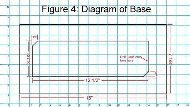 A. Corte el centro: la Sierra de calar que usted necesita para cortar un agujero rectangular - centrado en la base - que es 3 1/2 pulgadas de ancho y 12 1/2 pulgadas de largo. Vea la figura 4. Perfore el orificio de entrada para este corte cerca de uno de los extremos de la pieza que vas quitando - que vas a usar la pieza que corta. Hacer las líneas tan rectas como sea posible. El pequeño ángulo en cada extremo corresponde a las muescas en las patas para que sólo encajan en la base de una forma.
