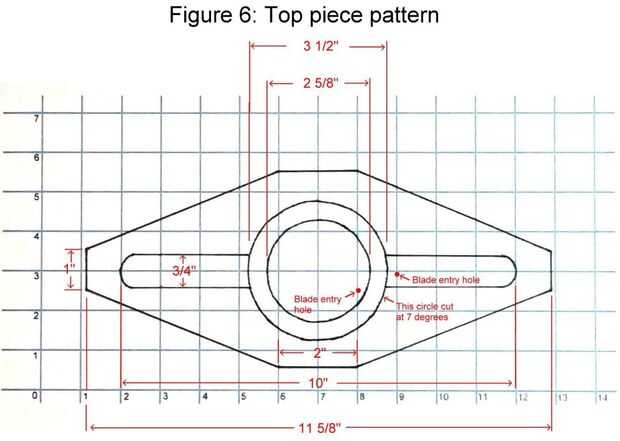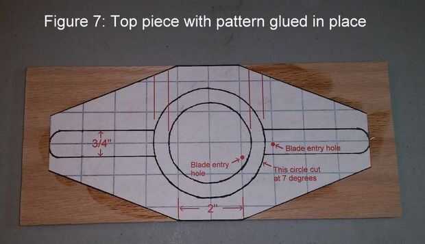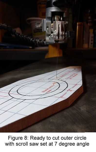 D. cortar el círculo exterior: Taladre un orificio de entrada de hoja en una de las zonas que se extiende hacia afuera desde el círculo externo como se muestra en el patrón. Ajuste su sierra a un ángulo de 7 grados y corte alrededor del círculo marcado exterior. Vea la figura 8. Ahora tienes un anillo que tiene un borde recto en el interior y un borde en ángulo por la parte exterior. Utilice un 1/4" redondo sobre pedacito para la parte superior (más amplia) en el borde del anillo de la derrota.