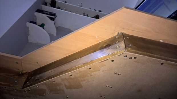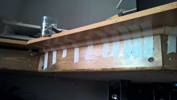 En primer lugar, es el hecho de que desde un ángulo de visión particular, los cursores son aún visibles - no muy sutil - usé algunos de la cornisa de 18mm que había dejado para cubrir. Simplemente rascado la superficie de la melamina de la parte inferior de la superficie de trabajo a lo largo de la longitud que sería ser colocar la cornisa, limpiada el polvo con un paño húmedo y luego aplica una fina capa de pegamento de impacto. Entonces, mientras que se secaba, cortar tramos de cornisa para replicar las longitudes del marco visible y arena suave. Cabe destacar que la cornisa del corte en un ángulo de 135 grados no es tan simple como uno podría pensar, mucho lijar y afinar se requieren para que las piezas para sentarse a ras. Después tuve todas mis piezas de la cornisa del corte para el tamaño y forma correctos, me aplica una cantidad bastante generosa de pegamento de impacto a la espalda, presiona firmemente en su posición y utiliza cinta adhesiva para mantenerlo allí mientras se secaba. Dejar curar completamente - alrededor de 24 horas - y luego retire la cinta. Cualquier sección que empareja el mal para la arena suave y parejo, no te preocupes los huecos visibles entre los tramos de cornisa como éstos se llenarán.