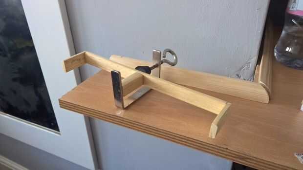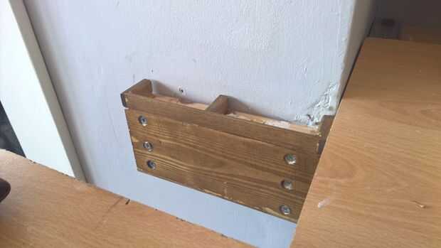 Comencé midiendo el espacio y decidir una configuración para el compartimento pequeño; tuvo que usar piezas delgadas de material con el fin de no reducir el espacio mucho más, tuvo que utilizar un material que no se verían fuera de lugar del resto de la mesa, y tuvo que ser bastante sólida en la construcción en caso de que se cayó en el tiempo.