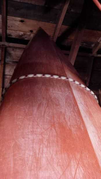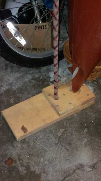 Con la punta de la piragua en el agujero en la pieza de madera, tanta gravedad está trabajando para usted que nada se mueve en el suelo. I cuidadosamente inclinó el kayak contra la viga, levantó un poco y había empujado los pies por debajo de ella. Con mi pie. Corrio todo un poco, asegurándose de que estaba muy cerca del vertical.