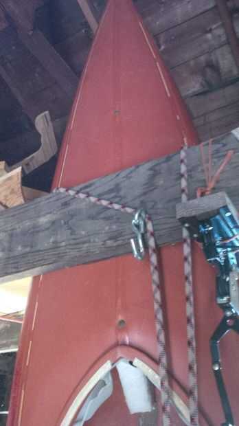 Ataron un lazo en un lazo de la cuerda cerca de cuatro pies de pie, lanzó mi cuerda sobre la viga, corrió alrededor del kayak, luego sobre la viga y el lazo. Tengo varios objetos atascados la viga que mantienen la cuerda en su lugar, pero si tu viga es prístina, usted querrá añadir algo a lo que mantendrá la cuerda cerca del kayak sin dejarlo deslizar hacia afuera: a pocos bloques de madera o un par de clavos estaría bien.