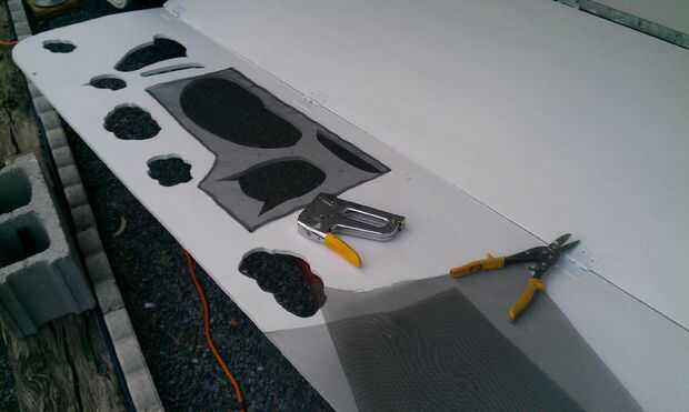 Utilizando grapas que son lo suficientemente cortas como para su madera. Doble los bordes de la pantalla y la pantalla mediante el doblado de la grapa sobre el área. Sólo tenía pequeños trozos de pantalla. Podría utilizar un pedazo grande de la pantalla y grapa alrededor de los orificios.