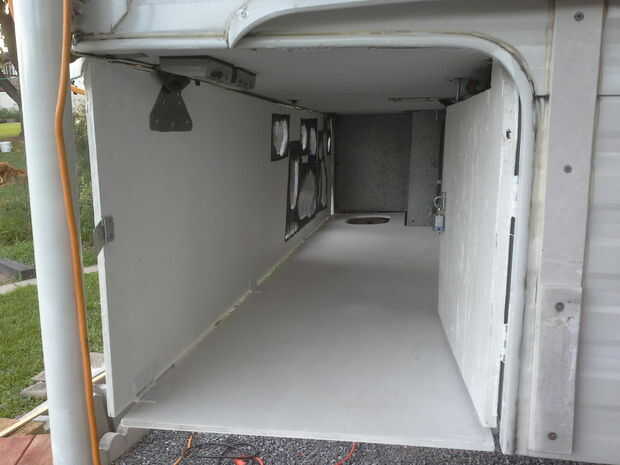 Si desea que su gato pueda obtener fuera de él necesita un orificio de acceso. Esto es una salida algo cauteloso para el gato ya que existe debajo del remolque. El agujero también tendrá una forma cerrada para cuando no queremos que el gato para salir. Puesto que no podemos montar cualquier cierres o herrajes sobre la madera contrachapada debe ser utilizado otro método para cerrar el agujero. Para cerrar la salida decidí hacer una aleta dobla abajo de la pared posterior del compartimiento. Si opta por sellar el agujero de esta manera que usted tendrá sin duda el orificio está cortado en un lugar que será cubierto por la aleta. Ver el siguiente paso para los cuadros de la aleta.