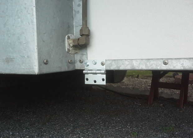 Después de que las bisagras están en el remolque alinear a su madera, taladre orificios piloto y fíjelo. Una vez más, tener en cuenta la acción de la bisagra. Las bisagras sentarse bajo mi madera en el piso del remolque. Usted puede terminar atornillar las bisagras rápido en el lado que no está indentado para el tornillo. Para colocar las bisagras en la parte superior la madera contrachapada al proyecto abajo del acoplado una media pulgada, bisagras de utilidad común no son este largas.