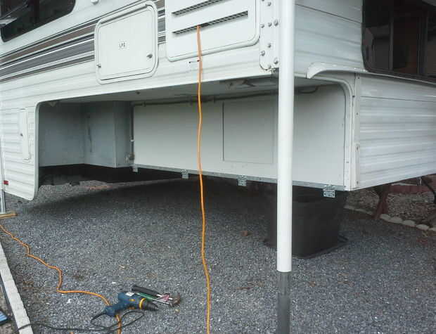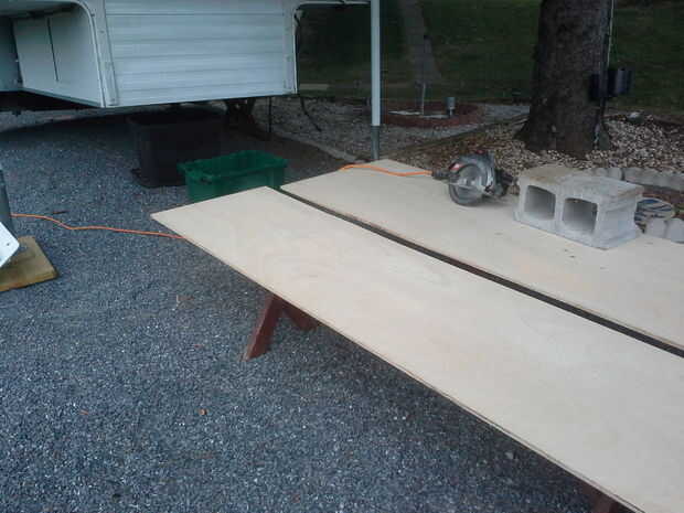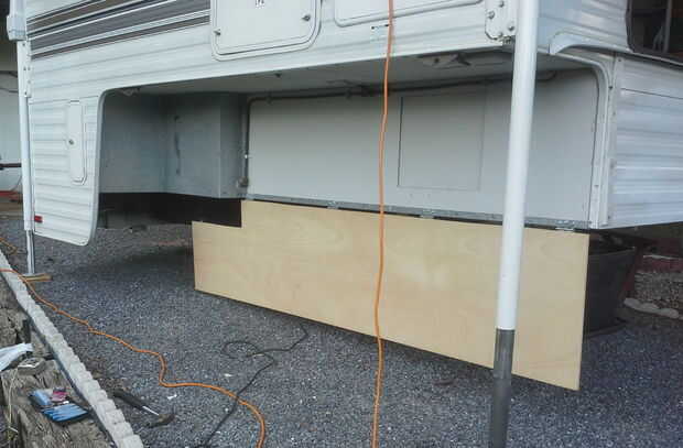 Para obtener la anchura del armario: medir desde el interior borde del remolque para el accesorio de metal que se pega hacia abajo de la proyección. Probablemente usted necesitará cortar un cuadrado de la pieza. Mida desde la parte delantera del remolque y determinar donde se debe hacer un corte hacia fuera. El lado del conductor y del acompañante de su remolque son probablemente diferentes. No trate de cortar ambas piezas de madera contrachapada a la vez a menos que haya determinado que son idénticas. Si el remolque es para una cama de seis pies, que tendrá que determinar la longitud, así. Remolques para una cama de 8 pies será ligeramente más largos que la pieza de madera contrachapada. Mi gabinete tiene una pequeña brecha hacia el extremo posterior del remolque. Opté por permitir este espacio porque en el lado del conductor puedo alimentar una manguera y cables por allí. No importa en las creaciones porque el espacio es demasiado pequeño para el gato ir a través y también proporciona más flujo de aire para él.