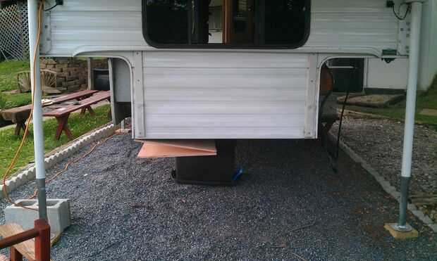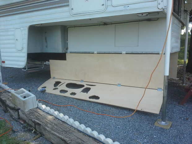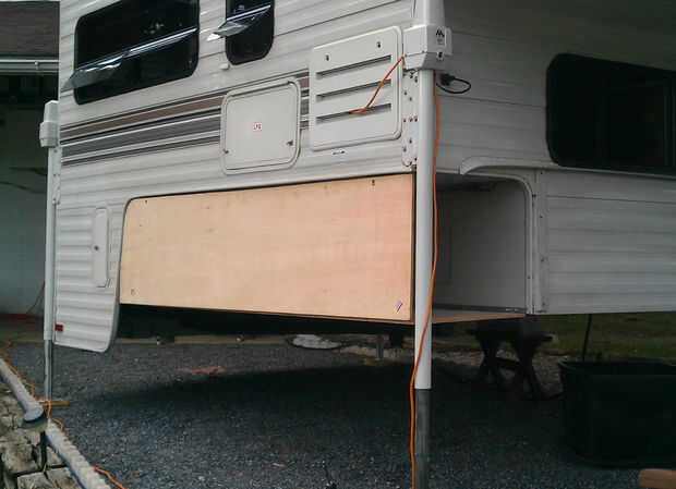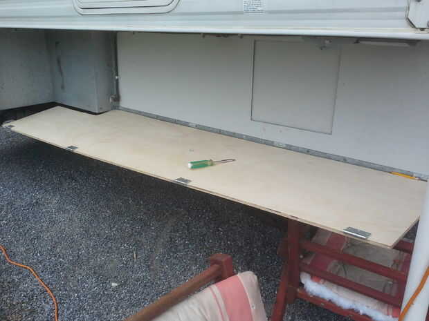 La altura del lado de su compartimiento será aproximadamente 1/2 de pulgada más pequeño que la distancia desde la parte superior de la pendiente al piso de su remolque. 1/4 de pulgada es de donde se encuentra con el piso y 1/4 de pulgada para el desmontaje de tiempo en la parte superior. Si no se corta un guión de la bisagra la madera debe ser menor a compenstate. Para cortar la curva hacia la parte posterior del remolque puede crear una plantilla de cartón. Alternativamente podría tener dos personas mantener la madera en la posición y seguimiento donde desea cortar.