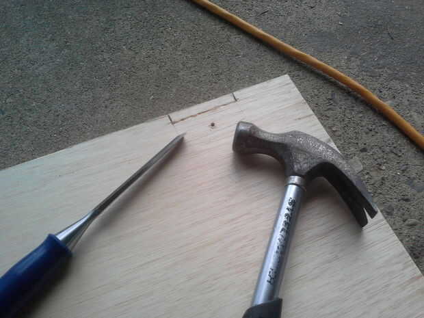 Si desea que ambas piezas de madera para sentarse juntas puede cincele un lugar para las bisagras. Colocar una bisagra cerca (tal vez una o dos pulgadas en) cada extremo y los otros equidistantes separados. Asegúrese de utilizar tornillos que no sobresalga de la madera contrachapada. Es generalmente más fácil fijar las bisagras a una pieza de madera contrachapada primero luego alinear por la segunda pieza de madera contrachapada y marca, cincel y perforarlo. Yo sólo había cincelado un lugar para la pieza redonda de la bisagra en el lado del compartimiento. Hacer lo que usted está cómodo con. Las costuras se podían hacer muy apretadas si quieres. No sentía necesidad de hacerlo.