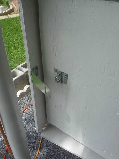Cuelgue el compartimiento de los ganchos si no lo ha hecho ya. Sujete el broche en la parte vertical del compartimiento del almacenaje. Coloque la segunda parte de la hebilla de bloqueo en la puerta. Como con las bisagras, asegúrese de que sus tornillos no son demasiado largos. Probablemente necesite obtener tornillos adicionales ya que los tornillos que vienen con el corchete son probablemente más de 1/2 pulgada.