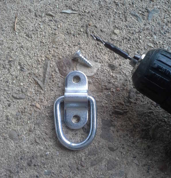 Una nota sobre el anillo de anclaje. Los anclajes del anillo se fijarán solamente para a corto plazo y sólo el peso de la madera contrachapada. No será muy fuerte simplemente atornillar el anillo anclas en las áreas fuera del remolque. Uso de tacos puede ayudar. Apernado a través es probablemente la manera más fuerte para pegarlas. Sólo usé tornillos grandes. Tienen pero debo usar los anclajes anillo cautelosamente. Utilice un orificio piloto si escarpias rápido. Un trozo de cinta envuelta alrededor de la broca le permitirá saber la profundidad a perforar.