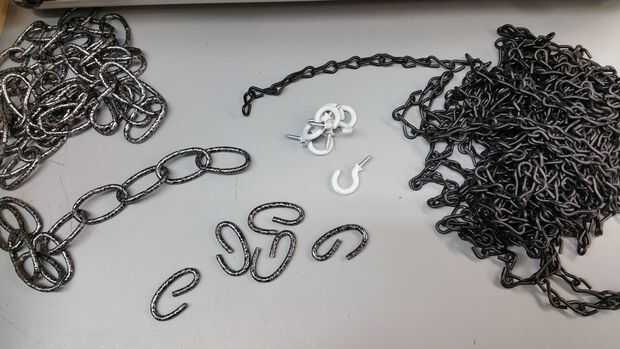 Me hicieron un viaje a la ferretería y recogió las cadenas y ganchos en la foto superior.