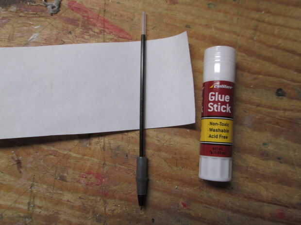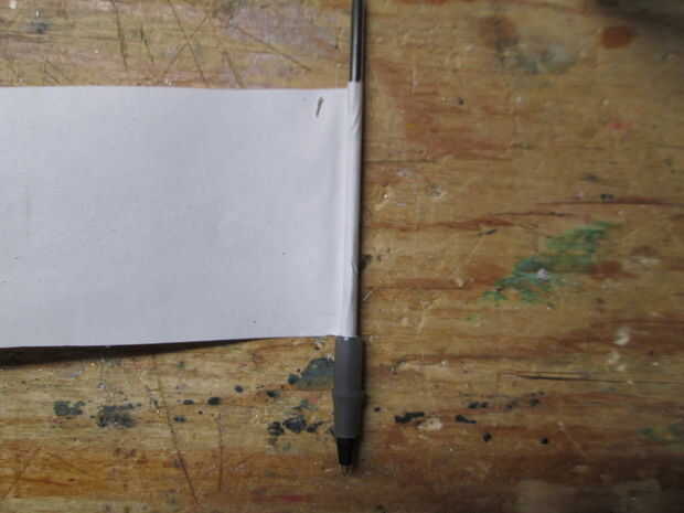 Enjabonó el tintero (Inkrod?) de la broca de la escritura-ey de la pluma que sería cubierta por el papel, y rodó sobre él el papel tan perfectamente como sea posible. Esto hizo que la pluma firmemente anclada en el papel.