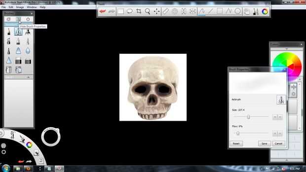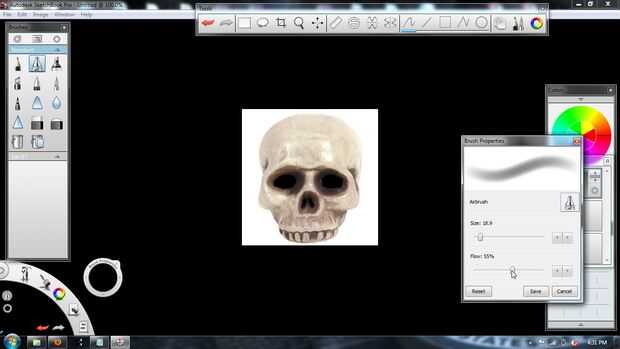 Establecer el tamaño del aerógrafo a entre 18 y 20 y el flujo alrededor del 55%. Asegúrese que el color es negro. Para acceder a la caja de herramientas de Color, haga clic en el pequeño círculo en la parte inferior izquierda dentro de la laguna.