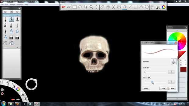 a continuación, seleccionar una sombra oscura agradable de rojo (118,19,19) y en las propiedades del aerógrafo, configurar el flujo a un 35%.