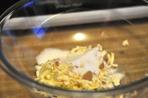 1-3. tenía a la mano crema mi mantequilla y azúcares, así que las dos primeras fotos son una solución a ese problema. He rallado mantequilla fría y había batida en el azúcar con un tenedor. Si usted tiene una mano o batidora, no es necesario rallar la mantequilla y solo uso la máquina para la crema de la mantequilla y el azúcar juntos.